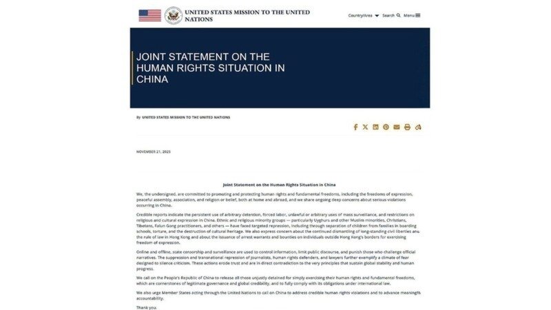 (Minghui.org) Fifteen member states of the United Nations issued a statement on November 21, 2025, titled: “Joint Statement on the Human Rights Situation in China.” The statement is also available on the United States Mission to the United Nations website.