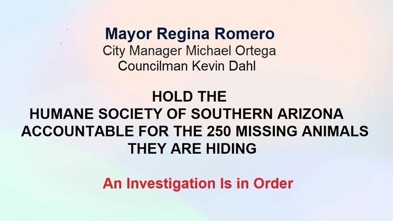 We the petitioners demand proof of life, we respectfully request Mayor Regina Romero, City Councilman Kevin Dahl and City Manager Michael Ortega honor their responsibilities and oversee the Humane Society of Southern Arizona’s unethical practices. We ask for full accountability of the 250 missing animals and that the safety and wellbeing of the missing animals be a priority of these administrations.