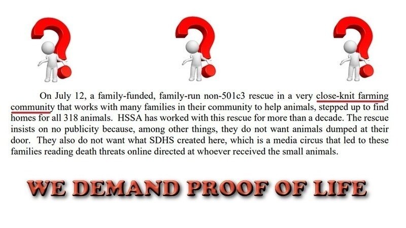 After SDHS sent a legal demand letter to HSSA for verifiable proof of the pets well being last week; a response letter from a Tucson law firm representing HSSA indicated the missing animals were sent to a Farming Community.