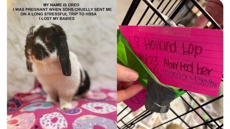 SDHS sent a pregnant rabbit named Oreo; she aborted her babies during this stressful situation. Oreo was one of the lucky 4 that were returned and is now safe in rescue
