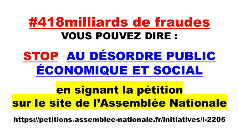Mise à jour sur la pétition418 MILLIARDS D'€ D’INFRACTIONS NON PERÇUS PAR L’ÉTATMERCI DE DIRE STOP AU DESORDRE PUBLIC ECONOMIQUE ET SOCIAL