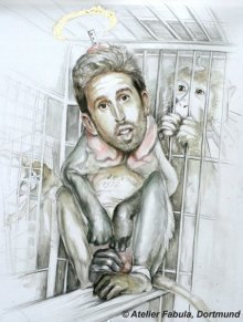 Das hier beigefügte satirische Bild "Affen unter Palmer" der Künstlerin Olivia Rost (Atelier Kunstwerk Fabula, Dortmund) aus ihrer Galerie "Tierversuche" bildet den Oberbürgermeister von Tübingen Boris Palmer ab - http://www.fabula-dortmund.de/pages/tierversuche/tierversuche-07.php