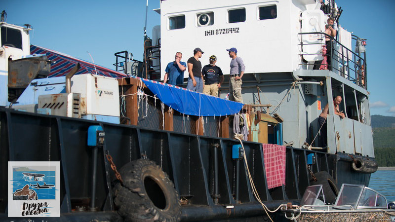 После обеда в залив Николая зашло судно «Юрий Швецов», на котором в настоящий момент находится две отловленные косатки. Всего на судне установлено четыре контейнера для перевозки животных. На обращение к экипажу корабля, посмотреть состояние животных, общественники получили закономерный отказ.