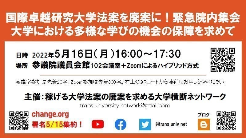 国際卓越研究大学法案が5月17日(火)にも参議院・文教科学委員会の1日だけの委員会審議で採決されようとしています。
