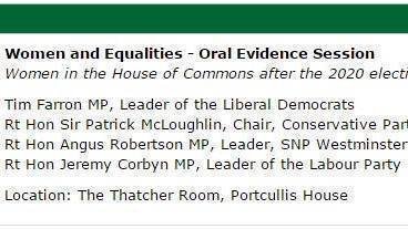 Tomorrow the Women and Equalities Select committee Inquiry "Women in the Commons" is taking evidence at 9.30 am from Jeremy Corbyn, Tim Farron, Sir Patrick McLoughlin and Angus Robertson. They are the witness panel = #manel.