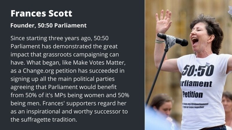 Petition update50:50 Parliament want women to have equal seats and equal say. Show you agree, SIGN NOW!Vote for Frances in The People's Democracy Award now - Thanks!