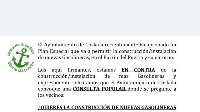Petition updateNO MAS GASOLINERASLA AA.VV BARRIO DEL PUERTO INICIA LA RECOGIDA DE FIRMAS PARA SOLICITAR UNA CONSULTA POPULAR