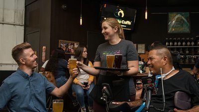 Image description: smiling white woman serves beer to 2 smiling men in a bar. The white man is not readily identifiable as disabled; the Black man uses a wheelchair and ventilator. Source: https://unsplash.com/photos/IEk05I-Is5A
