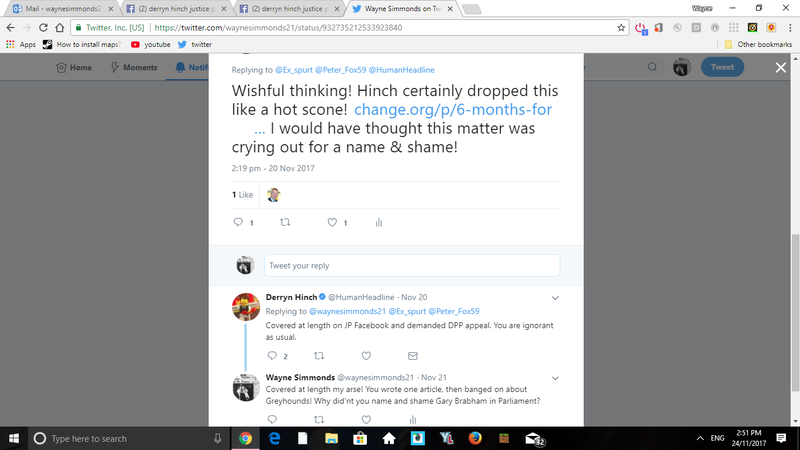 Derryn Hinch has labelled myself, Ignorant, for daring to question him as to why he has never mentioned Gary Brabham under Parliamentary privilege? Hinch's "Bizarre" excuse that he covered it extensively on the Justice Party "Facebook" Page. Here is the link to that page, which clearly shows it was mentioned "ONCE". Not Extensively as stated by Hinch. https://www.facebook.com/search/top/?q=derryn%20hinch%20justice%20party%20gary%20brabham%20posts Further more, somebody should inform Derryn that Facebook does not have "Parliamentary Privilege", i mean, i know Zuckerbergs powerful but really! Clearly Hinch is rattled i had the audacity to question him and has clearly lied when he stated that he'd covered this "Extensively" on F/B page. I urge you all to check that page out and you'll see for yourselves he mentioned it once! 171'000 voices never had their pleas replied to and i'm the Ignorant one? You will also note on Justice Party Page, Hetty Johnson, another one who has sat silent on this. The opportunity for all of us to demand change has feathered the nests of so many Unconscionable men and women by their own inactions! "Evil Reigns When Good Men Do Nothing"