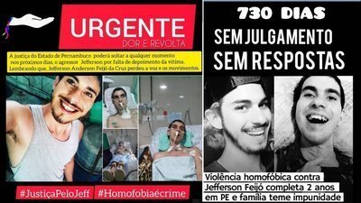 Jefferson Anderson Feijó da Cruz foi espancado a pauladas quase até a morte, estuprado e apedrejado aos 23 anos. O crime de homofobia completará dois anos na próxima segunda-feira, dia 7. Jefferson ficou em coma por dois meses por conta de lesões na cabeça, perdeu a voz e os movimentos. Depois de 7 meses internado, está em casa e recebe bem o tratamento, respondendo positivamente ao avanço.