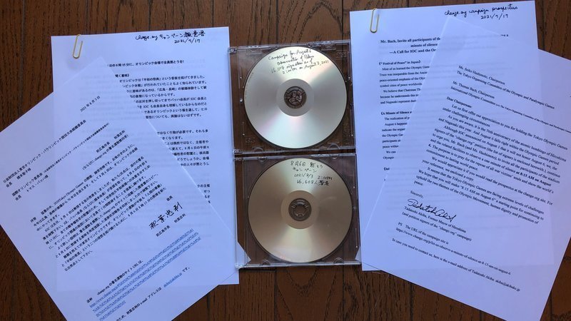 そのために、3日には、黙祷の要請文とこれまで皆さんから頂いた「賛同」のリスト名簿をCDに収めて、IOC組織委員会に郵送しました。写真を御覧下さい。