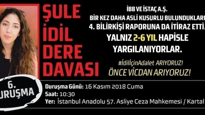 Şule İdil Dere Davası 6. Duruşması, 16 Kasım 2018 Cuma Saat 10:30’da İstanbul-Kartal Anadolu 57. Asliye Ceza Mahkemesi’nde görülecek.