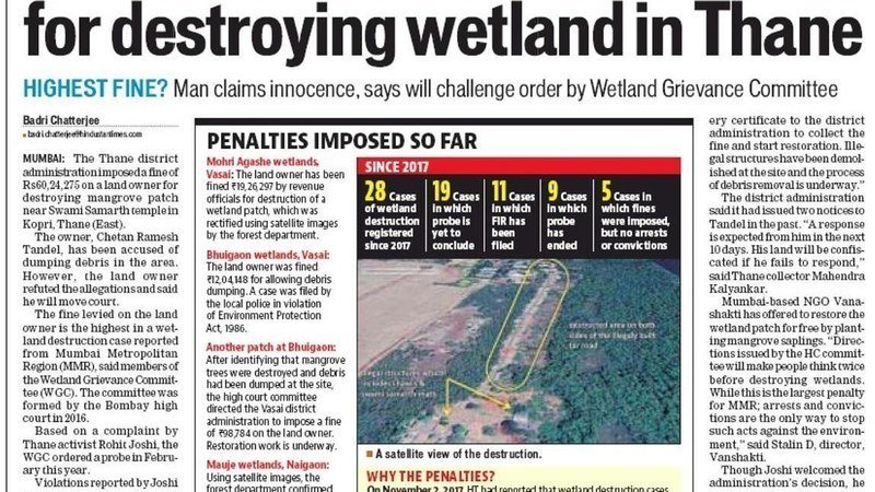 Similarly on our complaint , the Navi Mumbai Wetland Redressal Committee immediately wrote to CIDCO MD and Collector Thane in November 2017 to stop the work by Mistry Construction . However they should also impose fines on people responsible for it.