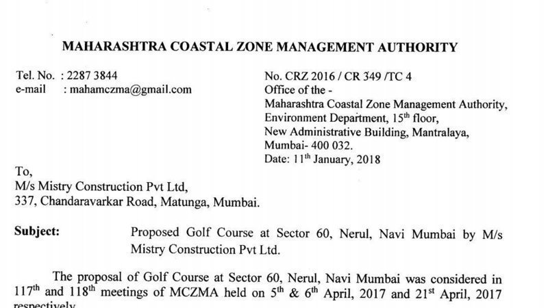Attaching herewith the approval letter given by MCZMA to Mistry Construction dated 11th January 2018 for Golf Course & residential towers.