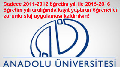 AÖF Sosyal Hizmetler Önlisans Bölümü 2011-2012 öğretim yılı ile 2015-2016 öğretim yılı aralığında kayıt yaptıran öğrenciler zorunlu stajının iptalini talep ediyoruz.