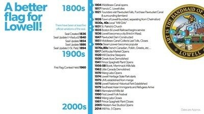 Lowell needs a better flag! Lowell's current flag was chosen in 1960, by a Lowell Sun-sponsored design contest. The winning entry was essentially a city seal from 1894 on a white background. In 1960, Lowell was a different place. It was just four years before 1960 that Boott Mills went under. And 1960 was 18 years before the Lowell National Historical Park was established, 19 before the first Cambodians settled here, and 46 years before places like Western Ave Studios & Mill No. 5 opened.