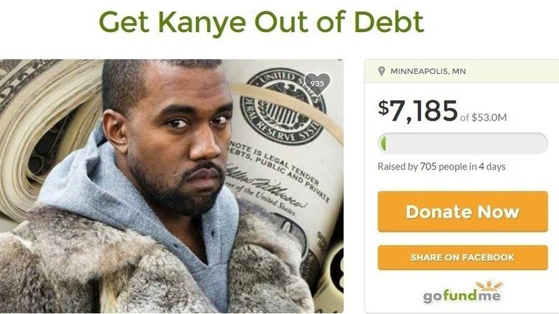 There has been a GoFundMe page created to help Kanye get out of his 53 Million dollar debt. His personal debt that he willingly put himself in. This page needs to be removed immediately and not be allowed to be created again.