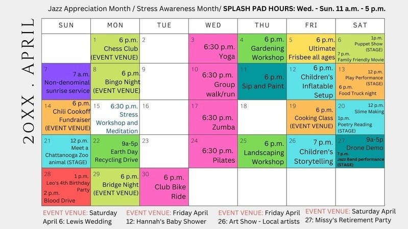 Walden View’s Village Green, adjacent to the grocery store, has a stage, splash pad and green space for activity play, offering the community many family fun outings. Here’s an example of what a programmed schedule during spring in Walden could look like with Walden View’s Village Green. The community space would be programmed with a monthly calendar of activities and events year-round such as food trucks, arts/crafts, fitness classes, celebrations, holiday festivities, dance performances, poetry readings, game nights and live music.