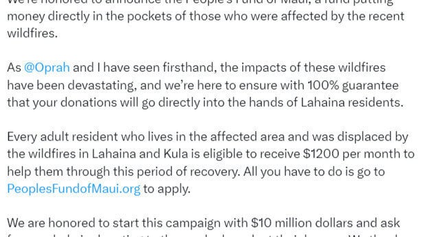 I have no idea if this petition somehow made this happen, but one of the points of it was to get more people to know what Dolly Parton did in Tennessee, and it turns out that somehow Oprah learned of what Dolly did and together with the Rock they have organized the People's Fund of Maui to provide $1,200 a month for the next six months to everyone displaced from their homes by the wildfires in Maui.