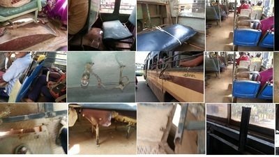 The condition of the above listed buses have been seen as unfit for passengers to travel in with following issues found: Broken ceiling, Driver’s seat and window pane broken, Passenger window pane broken, Electrical wiring all kept open and uncased, unsafe footsteps, broken window pane above the footsteps, lights broken, No medical kits, broken passengers seat, unfit seating for kids and old people, floor of the bus broken at various parts (sometimes one can see the wheels down under), Brake lights not functioning, Registration Number plate broken, Headlights non functional, etc.