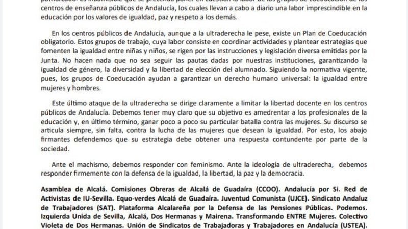27 organizaciones sociales, del mundo de la educación, sindicales y políticas han expresado ya su apoyo a una escuela igualitaria, y la lucha feminista, al tiempo que respaldan a la docente alcalareña atacada por Vox.