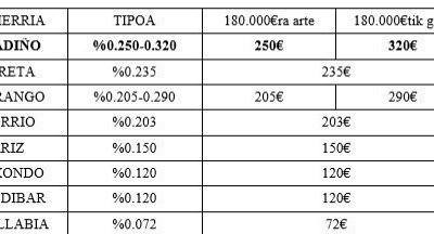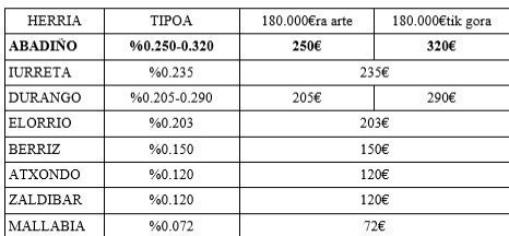 - Eliminación o modificación de la barrera de los 180.000€ que afecta a la mayoría de los caseríos del municipio y por la cual se aplica a la mayoría de ellos un tipo del 0,32%.