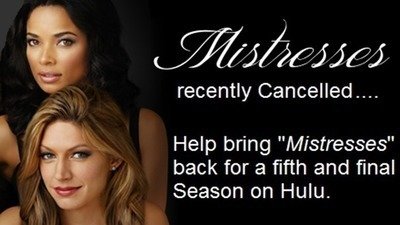 To many of our most beloved and favorite scripted TV Shows are abruptly cancelled without a proper goodbye. This is our chance to take a stand and inform these networks that true fans deserve closure. ABC recently axed its hit summer series "Mistresses" after four fabulous seasons. Hulu however has streaming rights to "Mistresses" episodes and it is possible the VOD streaming service could pick up the sexy hit series for a fifth and final fling. Please support this amazing show because there is strength in numbers.