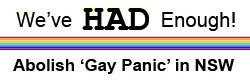 Following the recent struggles in Queensland to eliminate ‘Gay Panic’, New South Wales remains one of the last states in Australia where “Gay Panic” and “Homosexual Advance Defence” (HAD) principles associated with the ‘Homosexual Provocation’ defence continue to exist as a legal loophole that encourages homophobia, and acts to legitimise and reinforce a culture of violence and hatred towards homosexuals.