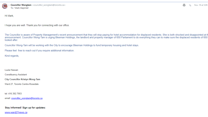 Kristyn Wong Tam's assistant sent out a response acknowledging the situation and how the city plans to put pressure on Bleeman Holding's to do the right thing!