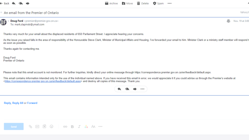 Petition updateProvide Emergency Housing for Victims of 650 Parliament FireDoug Ford's Office Responded