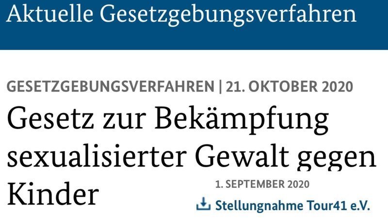 Lest dazu unsere => Stellungnahme Tour41 e.V. zum Gesetz zur Bekämpfung sexualisierter Gewalt an Kindern mit dem Schwerpunkt Verjährungsfrist auf der Seite des Bundesministeriums der Justiz (ganz unten).