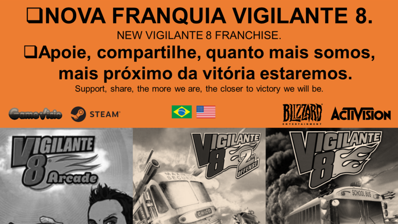 Apoie o abaixo assinado para um novo jogo ou remasterização do game "Vigilante 8 Second Offense" lançado em 18 de novembro de 1999 para Playstation One, Nintendo 64 e Dreamcast. A comunidade fã do jogo espera por uma nova franquia há anos e com um novo lançamento do game também chamaria muitos outros que não tiveram a oportunidade de jogar em seu lançamento, o mercado de jogos está carente com a falta de games no estilo o qual a franquia "Vigilante 8" & "Vigilante 8 Second Offense" proporciona com seu estilo de jogo único com combate entre carros com armas e outros itens em uma arena. A Activision, atual detentora dos Direitos da franquia deixou o jogo que foi um sucesso no passado em seu atual esquecimento, a mesma lançou um novo game da franquia em titulado de "Vigilante 8 Arcade" lançado somente para Microsoft XBOX 360 e não ter atraído muito público pois foi lançado em um mercado restrito inclusive impossibilitando de achar o mesmo na loja online brasileira, tendo que trocar sua região para pode acessar a área de download. A intuição do abaixo assinado é tentar reviver a franquia que hoje se encontra em um profundo esquecimento devido ao enorme tempo desde seu último lançamento, com o apoio de todos esperamos tentar conseguir inúmeros votos para tentar fazer a Activision pelo menos abrir os olhos, por isso contaremos com a assinatura de cada um que a propuser em assinar.