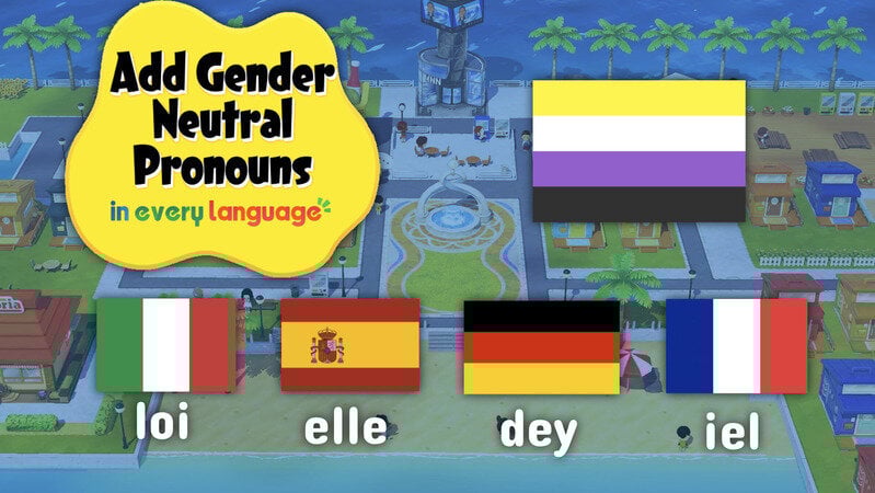 Add gender neutral pronouns to every localization of Tomodachi Life Living the Dream