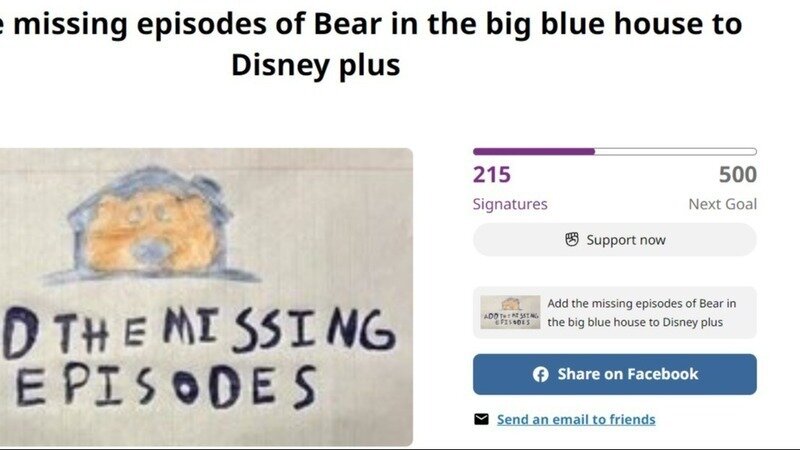 Petition updateAdd the 9 missing episodes of Bear in the big blue house to Disney plus200 Signatures