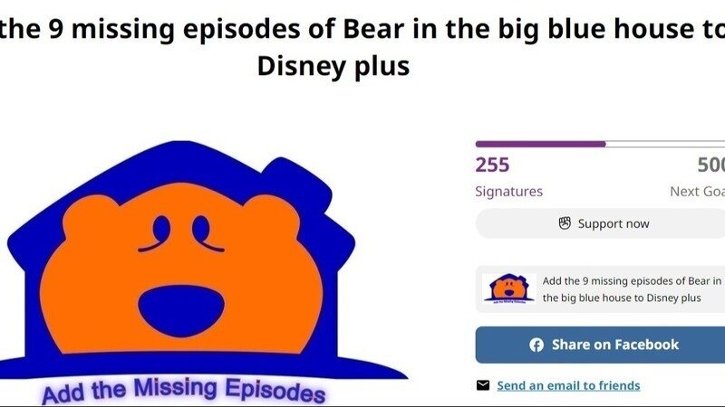 Petition updateAdd the 9 missing episodes of Bear in the big blue house to Disney plus250 Signatures