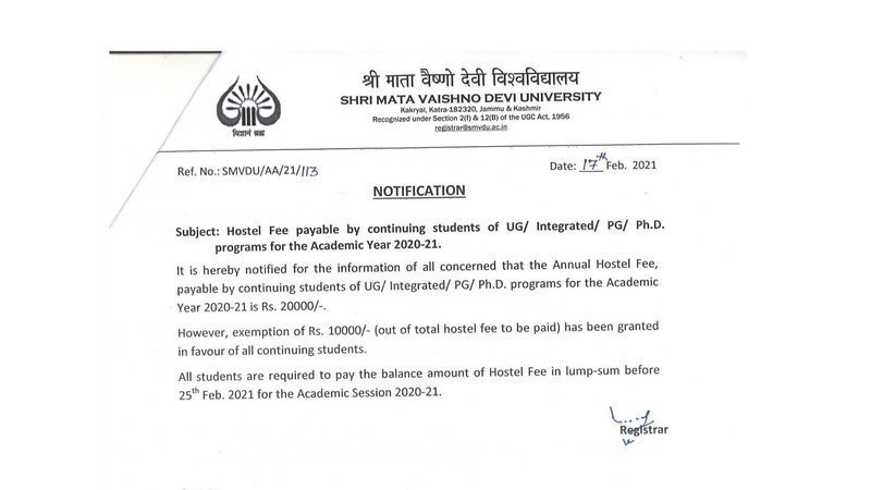 The following petition is regarding the Mail received by the continuing students of Shri Mata Vaishno Devi University for the academic year of 2020-2021 to pay the annual hostel fee of 20,000 INR. With an exemption of 10000 INR.