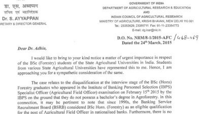 The case is relates to disqualification at the interview stage of the Bsc (Hons.) Forestry graduates who appeared in the IBPS Specialist Officer examination on February 15th 2015 by the IBPS on the ground that they do not possess a bachelor's degree in Agroforestry ,in this connection ,it may be pertinent to note that since 1990's, the Banking service Recruitment Board ( BSRB) considered Bsc Hons ( forestry ) as a eligible qualification for the post of Agriculture field officer in nationalised banks .whereas they are allowing Bsc ( Hons) Forestry for Agriculture officer in IBPS RRBs Specialist officer http://www.ibps.in/cwe-rrb-iv/