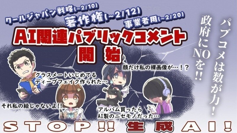 - 「AIと著作権に関する考え方について(素案)」に関する意見募集の実施について(~2/12まで!先日アクセス過多で鯖が落ちてたのでお早めに!)