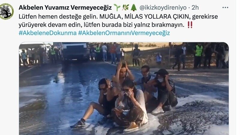 Bu sabah nöbet alanımız ablukaya alındı, gözaltılar var ve çok seri bir şekilde eş zamanlı olarak ağaçları kesiyorlar. 18 kişi gözaltında. Gözaltılar sırasında orantısız şiddete maruz kaldık. Yerlerde sürüklendik, ellerimizin üzerine basıldı. Lütfen bizleri yalnız bırakmayın. Herkesi Akbelen Ormanı’na dayanışmaya çağırıyoruz! Bulunduğunuz illerde tepki göstermeye çağırıyoruz. Akbelen’e yola çıkın, sosyal medya hesaplarınızdan itiraz edin, bulunduğunuz illerde Akbelen için örgütlenin, ses çıkarın! Limak Holding’in orman suçlarını, arkadaşlarımıza uygulanan şiddeti duymayan kalmasın!