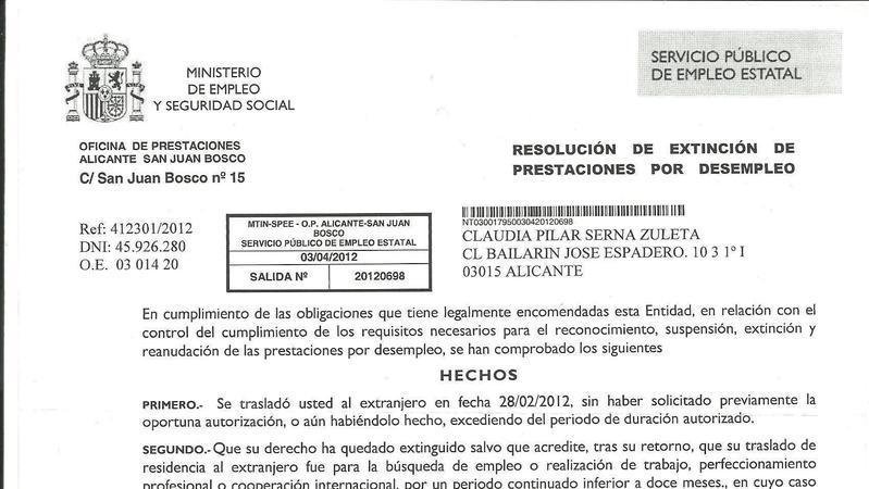 Hace un año y ocho meses me quitaron la prestación por desempleo por irme a Colombia a cambiar las protesis PIP que llevaba en mis pechos y que atentaban contra mi salud, tal como lo han manifestado los médicos ante los diferentes medios de comunicación; visite la seguridad social para solicitar que me quitaran dichos implantes y me dijeron que solo los quitaban cuando estuvieran rotos; angustiada pensando que tengo dos hijos pequeños, busque la alternativa de un cirujano plástico particular y me presupueto en 6000 euros la operación; por lo cual decidi viajar a colombia donde al cambio de moneda la intervención me salía por 1600 euros mas 800 del billete; así lo hice, fui a la oficina de empleo de alicante e informe que viajaba y el motivo del viaje; me manifestaron que no podía estar fuera del país por mas de 15 días y les dije que dicha intervención con las horas de viaje se ponía en minino 22 días para el regreso tal como me lo había comentado el médico que me operaría, me dijeron (verbalmente un funcionaario) que no habia problema al tratarse de una intervención médica. Con sorpresa encuentro a mi regreso que después de presentarme en la oficina de empleo llega a los 15 días una notificación conforme se me avisa que HA QUEDADO EXTINGUIDO MI DERECHO A LA PRESTACION POR DESEMPLEO.  A consecuencia de esto mis dos hijos y mi madre de 72 años a mi cargo, estamos pasando necesidades económicas significativas, considerando que soy la responsable familiar. Además que NUNCA he estado en el paro, solo cobre un me y tenía derecho a 24 meses, que es un derecho del trabajador la prestación por desempleo.