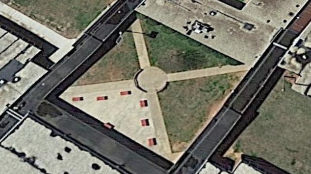 Central to the grounds of the school is a gathering space known as "senior circle" which is clearly shaped like the confederate flag, in which the "bars" are represented by the sidewalks and the "stars" were represented by the benches.