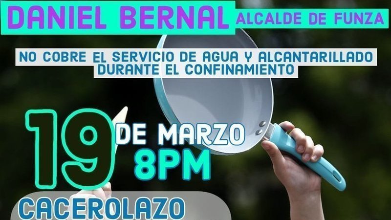 Hoy asómate a tu ventana y saca la cacerola, le vamos a decir al alcalde de Funza Daniel Bernal, que para atenuar los efectos económicos adversos puede tomar la decisión que la Ley le permite: ¡Suspender el cobro del acueducto y alcantarillado de Funza! Hacerlo durante esta emergencia, mientras la ciuadadanía estará restringida a permanecer en sus casas. Es muy importante que no se siga facturando el servicio para permitirle a toda la ciudadanía, en especial los menos favorecidos, que puedan gozar del líquido vital, necesario para el primer cuidado frente al COVID-19, el lavado de manos.