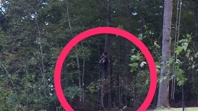 A hunter sits in a tree stand in a neighbor's yard overlooking my friend Cindy's yard. She took this photo of him with her cell phone. Cindy's yard is posted - NO HUNTING. But if a deer passes below this tree stand, the hunter will shoot it with his bow and arrow, and it will probably run across Cindy's lawn, wounded and in pain. She can see him from her deck and is likely to witness a kill. She will be in danger of the injured deer ramming her or her dogs. This is a dangerous situation. Bow hunting in residential areas in the Town of Huntington should never have been allowed and it must be banned.