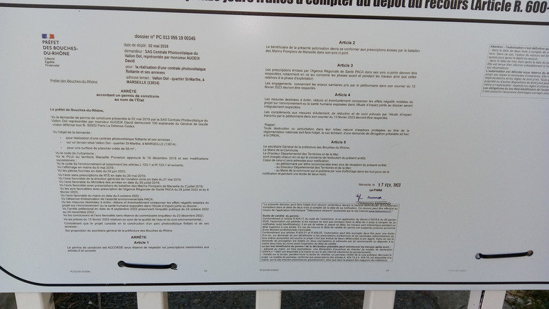 Au décours d'une balade autour du site du vallon dol, nous sommes tombés en arrêt devant un panneau affichant le Permis de construire la centrale photovoltaïque flottante, signé par le Préfet le 17 02 2023.