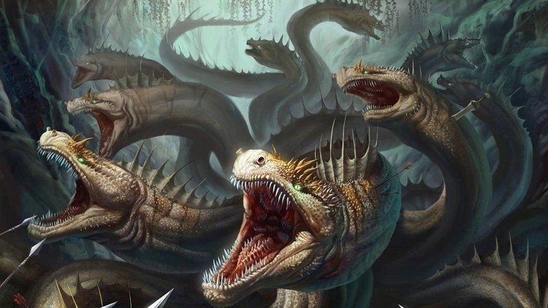 The Lernean Hydra was, according to Greek legend is the offspring of Typhon and Echidna, a gigantic water-serpent like monster with nine heads, one of which was immortal. The monster’s haunt was the marshes of Lerna, near Árgos, from which the monster periodically emerged to kill the people and livestock of Lerna. Anyone who attempted to behead the Hydra found that as soon as one head was cut off, two more heads would emerge from the fresh wound.