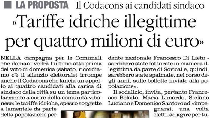 Interviene anche il Codacons sulle elezioni comunali di Vibo Valentia, lanciando la propria sfida ai quattro candidati alla poltrona di sindaco. “Le tariffe idriche sono state un tema troppo sottovalutato in questa campagna elettorale e così l’associazione ha deciso di svelare le somme che i cittadini di Vibo hanno pagato in più per i canoni idrici. Somme che - spiega il Codacons - sarebbero state fatturate in maniera illegittima da parte di Sorical e, quindi, sarebbero state spalmate, nel corso degli anni, sulle bollette inviate alla popolazione. Invitiamo i candidati a sindaco ad impegnarsi, una volta eletti, ad agire per tutelare gli interessi dei cittadini ed accertare l’illegittimità delle tariffe”. Il Codacons si dice quindi “pronto a sostenere la futura amministrazione perché parliamo di ben quattro milioni di euro richiesti agli utenti di Vibo in maniera illegittima”. Intanto, in attesa delle risposte da parte dei candidati, il Codacons preannuncia una raccolta firme a corredo di una petizione per chiedere la corretta determinazione delle tariffe. “Ora la parola passa ai candidati. Vedremo chi avrà concretamente a cuore gli interessi della popolazione tanto da sfidare il colosso Sorical e meritarsi il sostegno del Codacons”.
