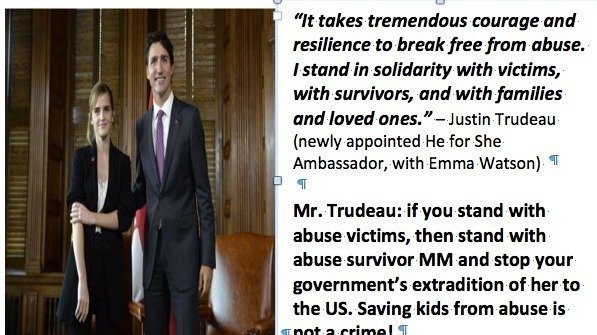 Today, Justin Trudeau declared: "There must be zero tolerance for violence against women...I encourage everyone to think about how their own personal actions matter." We agree, and we therefore invite the Prime Minister to consider his own government's illegal actions in trying to jail a female abuse survivor whose only "crime" was to save her kids from an abusive father. Please sign and share this petition on facebook and twitter to keep a Canadian family together: https://www.change.org/p/justin-trudeau-stop-illegal-extradition-of-abuse-survivor-and-single-mom-mm