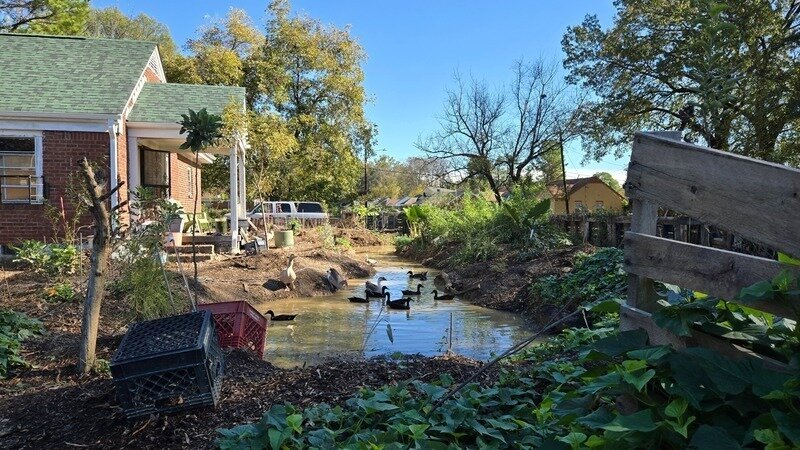 The pond in the photo is our new location. The pond in the video is the first pond we did. Learning to create ponds definitely has a steep learning curve and though it is a labor of love, it also helps to store plenty of water for the ducks, geese, and chicken (only one chicken currently!) can use to bathe, drink, or play in.