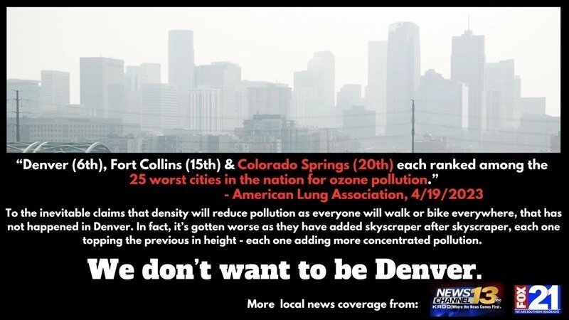 To the inevitable claims that density will reduce pollution as everyone will walk or bike everywhere, that has not happened in Denver. In fact, it’s gotten worse as they have added skyscraper after skyscraper, each one topping the previous in height - each one adding more concentrated pollution.