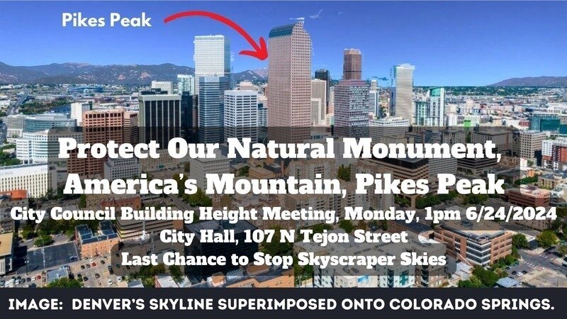 We are at a critical juncture in our fight to preserve the unique character of Colorado Springs. The City Council is considering a radical and permanent change to our skyline by allowing skyscrapers downtown. This is our LAST SHOT to make our voices heard and ensure the will of the people is respected. Please continue to use your email and social media to share the petition and updates to drive the signatory numbers as high as possible before Monday. Download the Q/R code and make a flyer and walk your neighborhood street. The developers are using all their money and might to get this first skyscraper passed so all the others planned will soon fill our skies with glass and concrete not only blocking views but creating and densifying pollution as well as heat islands.